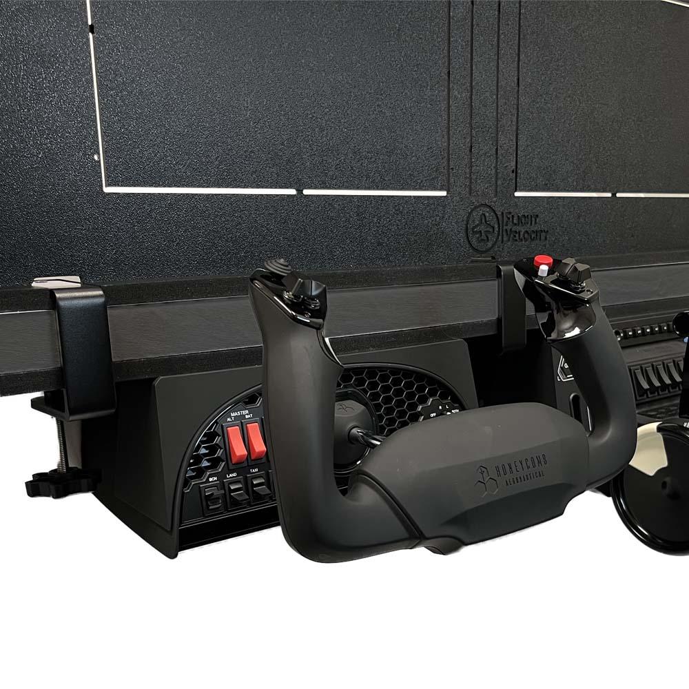 The Flight Velocity Flight Control Under Desk Mount lets you easily mount your Honeycomb Alpha and Bravo under your desk! Our simple system doesn't require drilling holes in your desk. Instead, we utilize the mounting clamps supplied with the Honeycomb Alpha and Bravo to provide a simple and efficient under desk mounting solution for your flight sim.